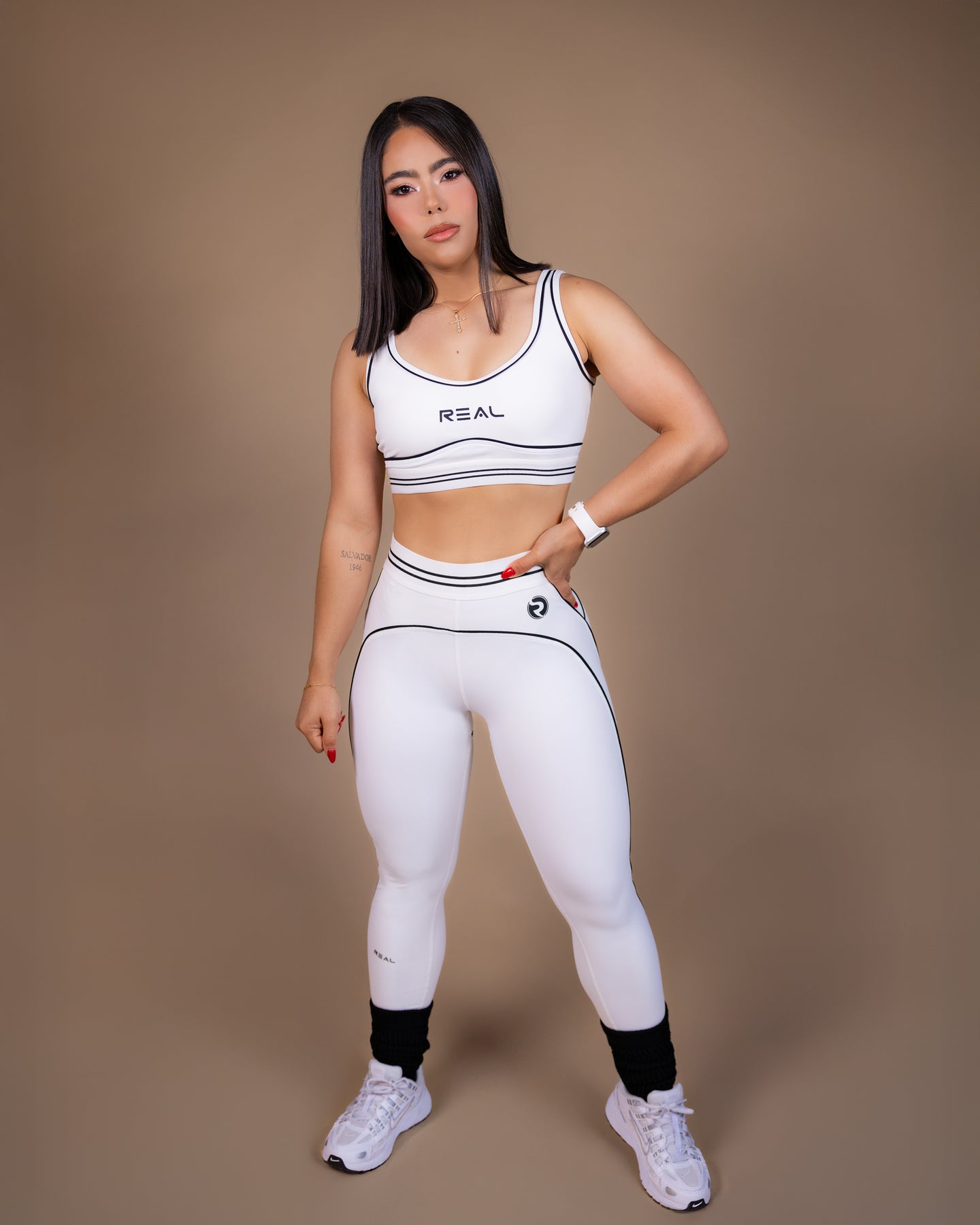 The Full Force Set is a two-piece powerhouse, combining a sleek, supportive racerback crop top with high-rise leggings designed to sculpt and move with you. The top features reinforced straps and sculpted seams that stay in place through every rep, lift, or sprint. The leggings contour with a seamless front, curve-defining back panel, and bold signature piping that elevates your shape and your stride.