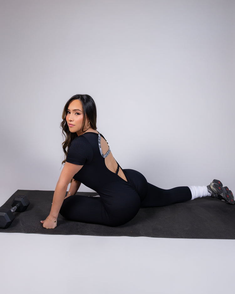 This full-length, ribbed jumpsuit features short sleeves and a bold open-back design. A circular cutout is framed by our Real signature elastic, with a secure snap closure at the top and an additional adjustable strap at the lower back to sculpt the fit. Finished with a flattering V-cut and scrunch detail, this piece blends bold structure with sleek femininity.